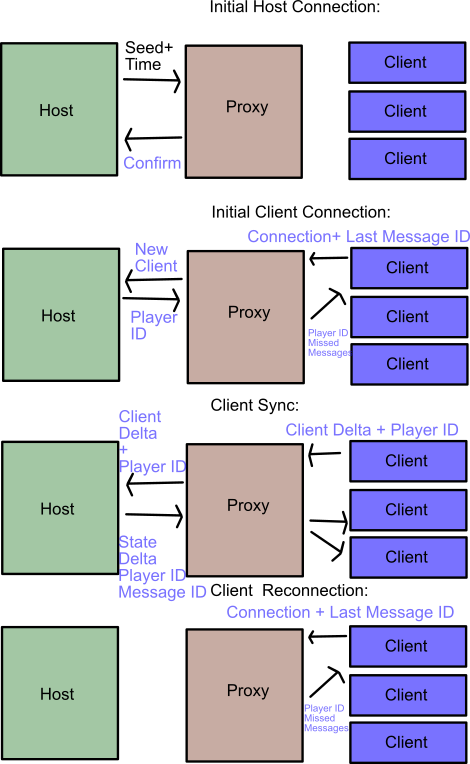 I already have the major encoding and decoding for the net information worked out, but I still need to actually create the script that the host, client, and the proxy server have to run. The important thing for that is what the actual messages will look like. Here is a diagram of how I'm working out what needs to be sent for each interaction.